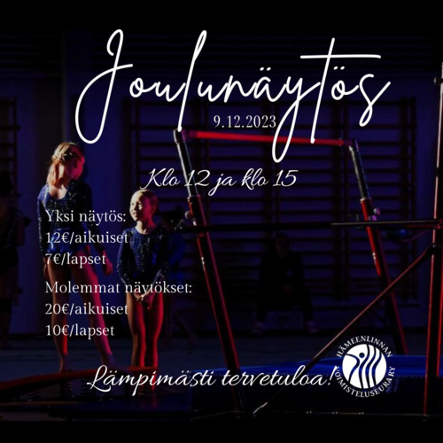 TERVETULOA Hämeenlinnan Voimisteluseuran joulunäytöksiin lauantaina 9.12. klo 12 ja klo 15 Tavastia-Areenalle!